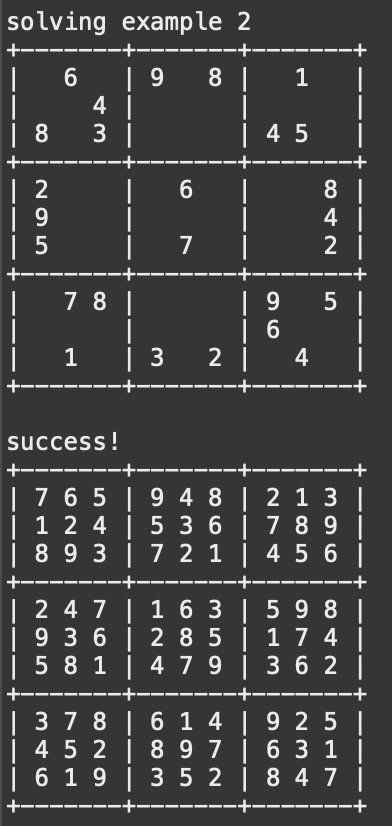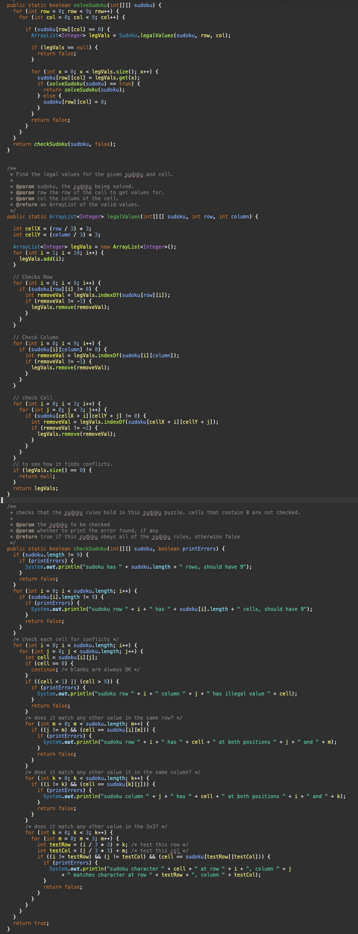 This was achieved by using backtracking and recursion. The main concept of how the program works is by slowly filling each cell with a legal value till there is either a solution or there is a problem along the way. Once a problem is discovered it will backtrack and try other possible legal values until a solution is found. Once a solution is found it is tested to make sure the solution is correct and follows the rules of Sudoku.